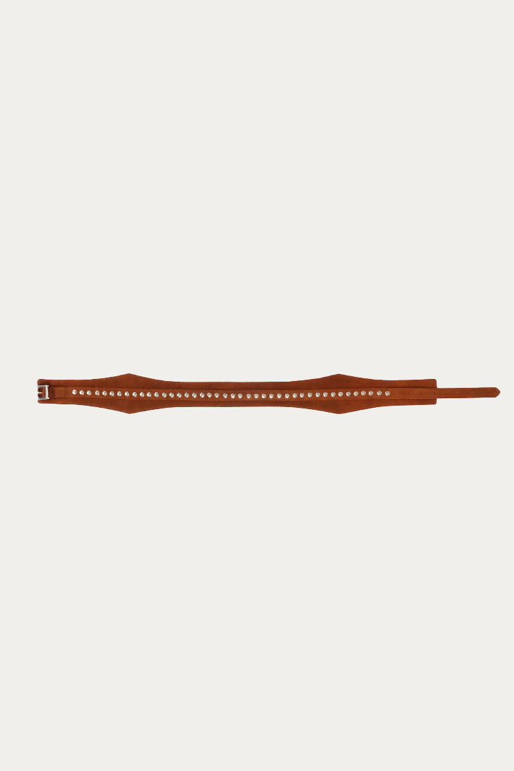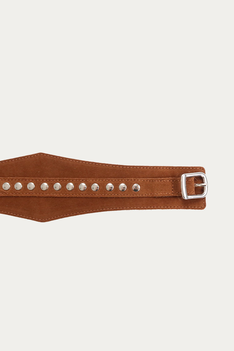 Cinturón de piel, acabado serraje decorado con tachuelas plateadas. Mide 90 cm de largo.