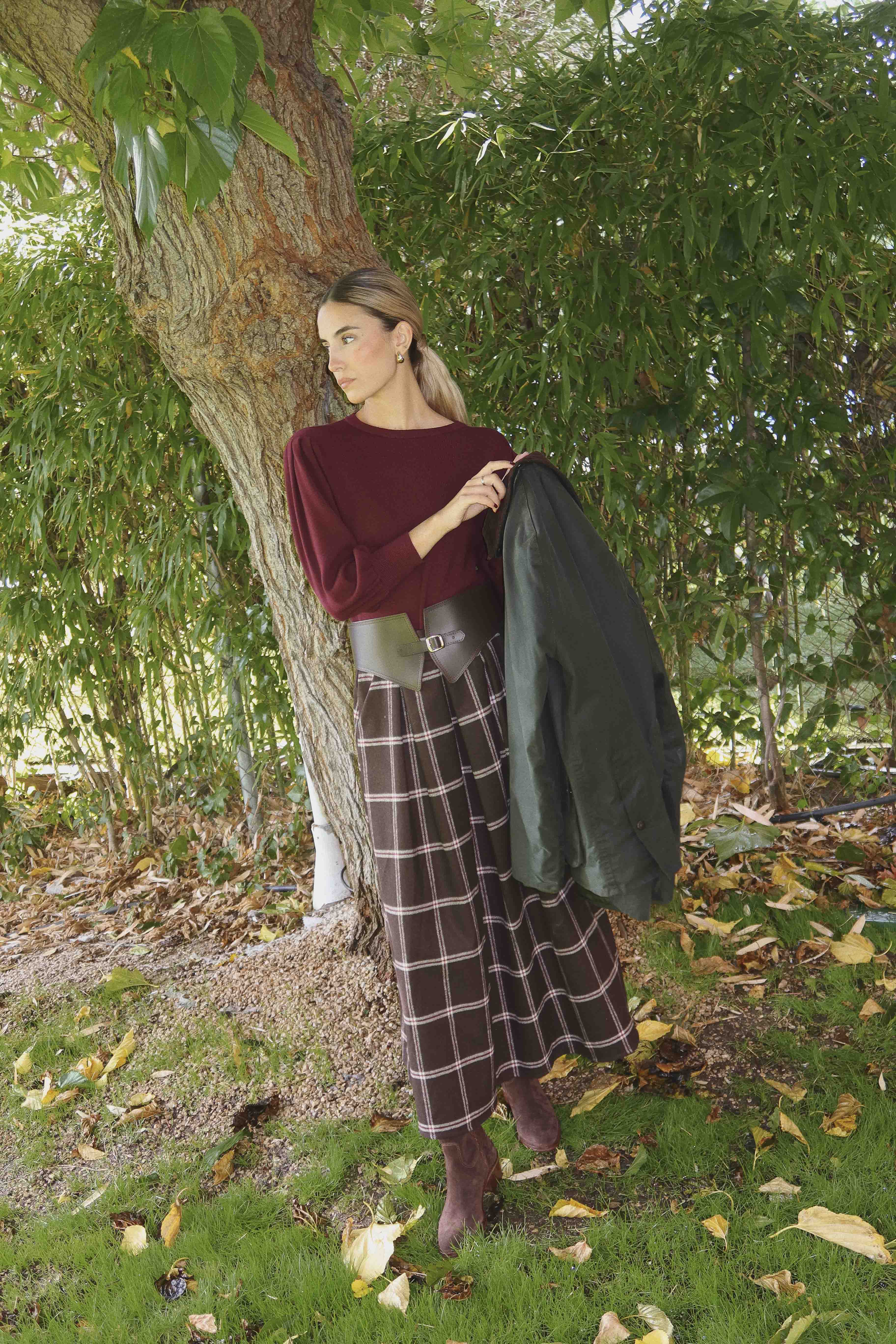 Falda de tiro alto con pliegues delanteros. Cintura elástica.