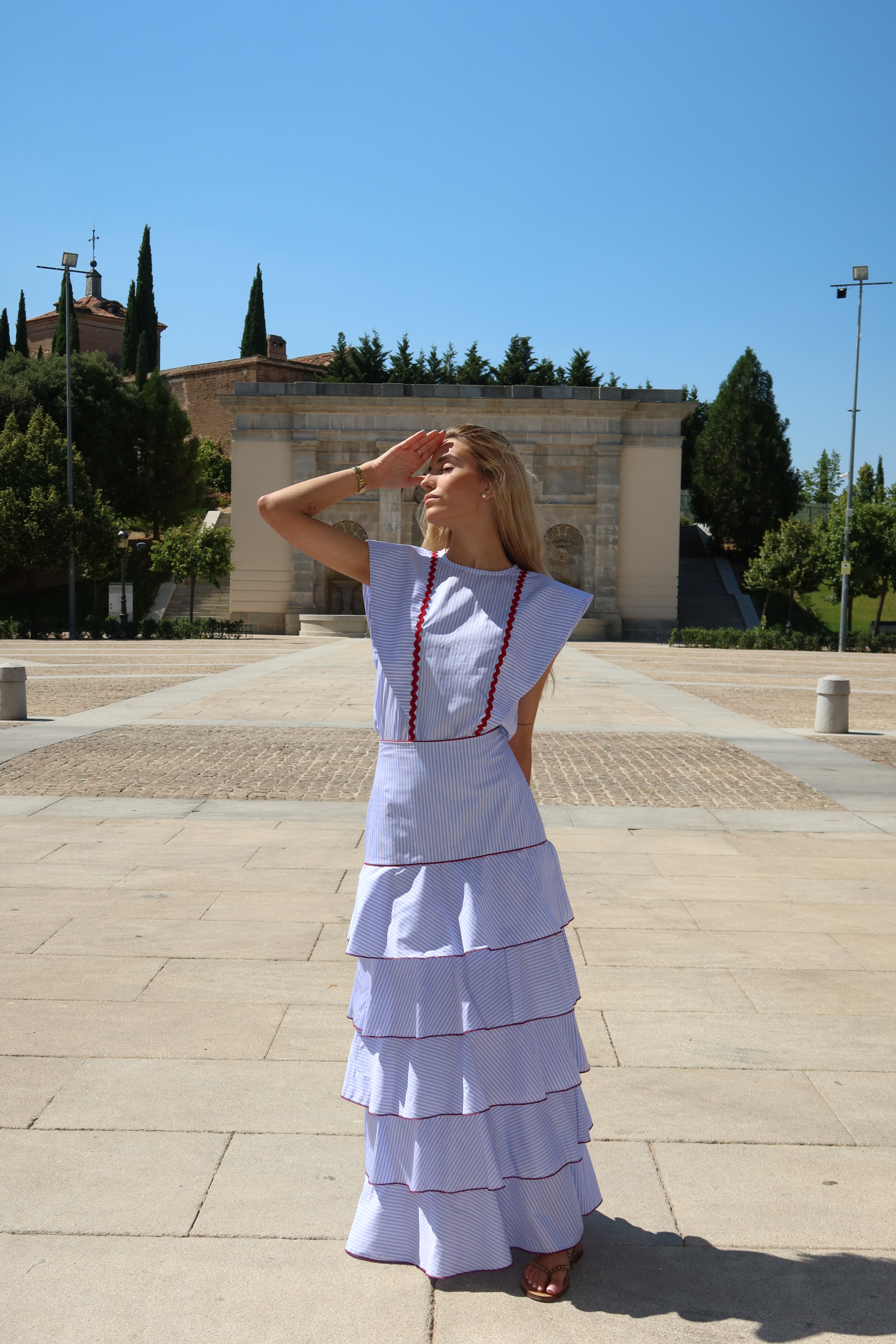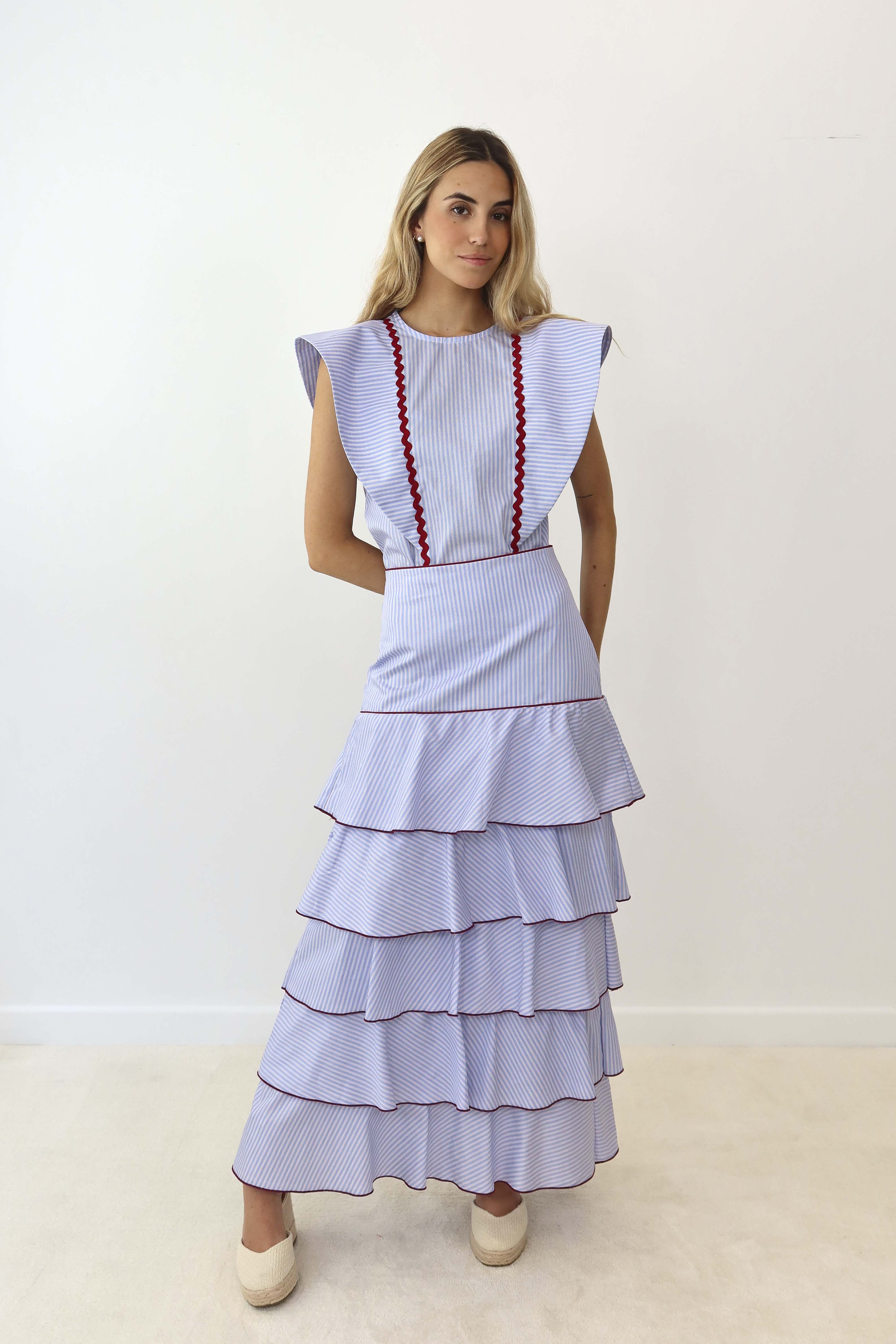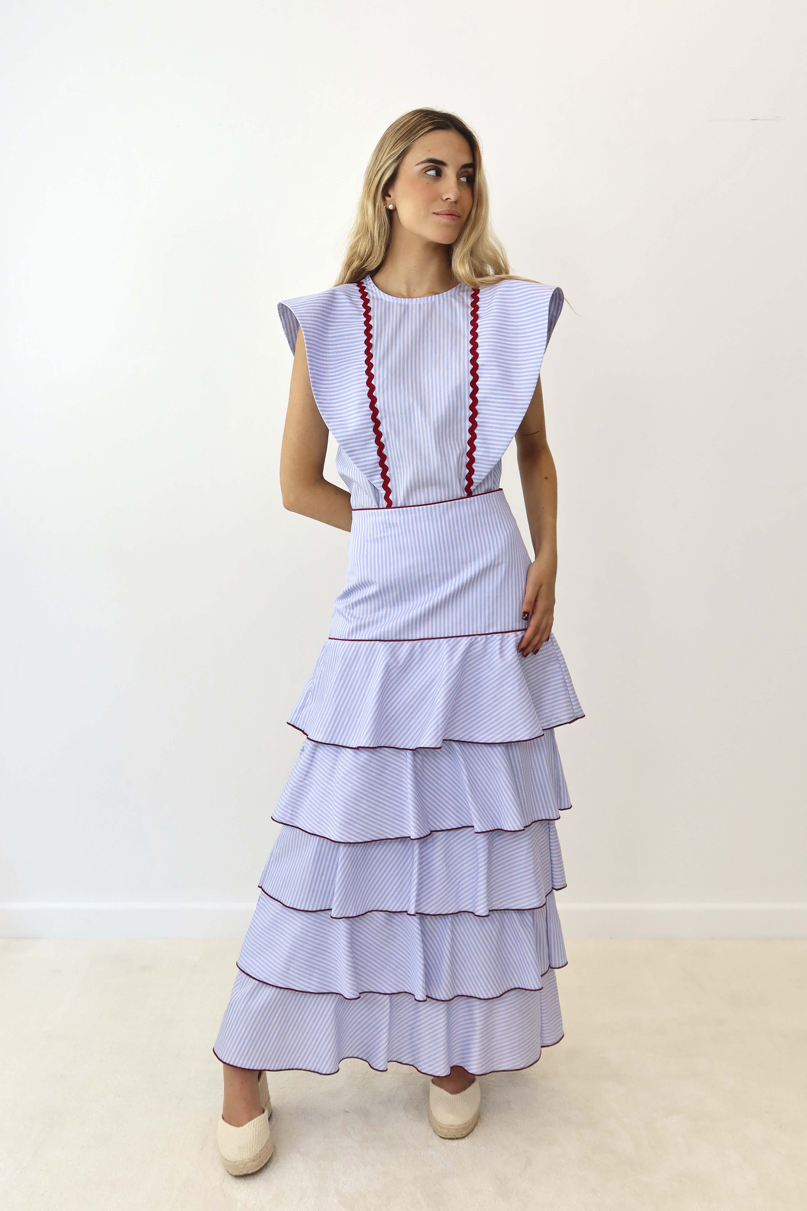 Falda larga decorada con volantes. Cierre trasero con cremallera oculta.