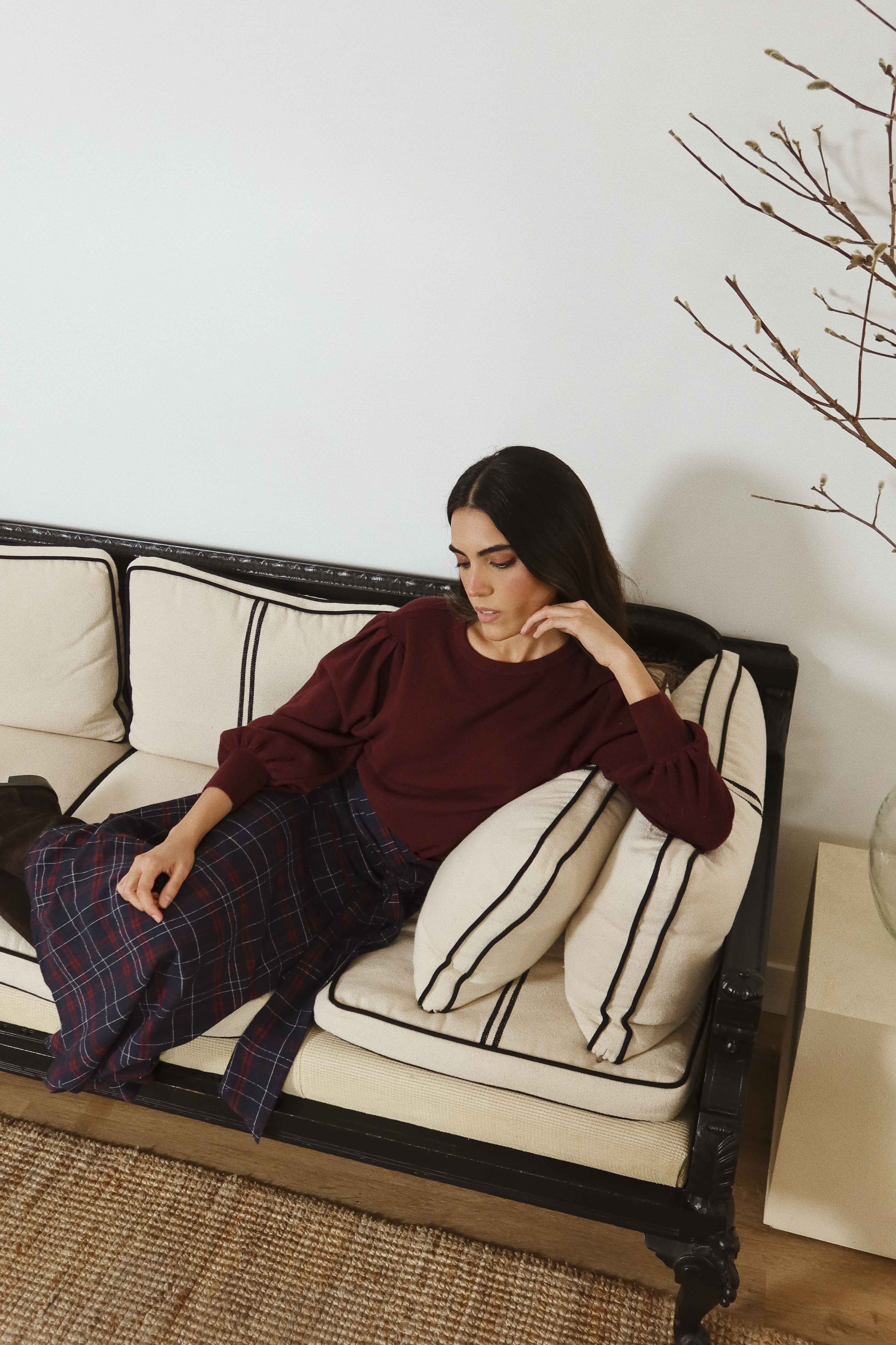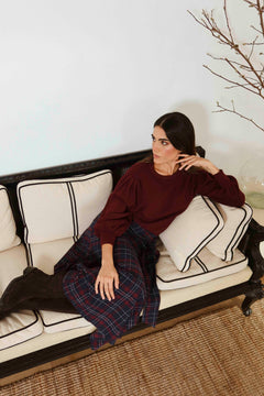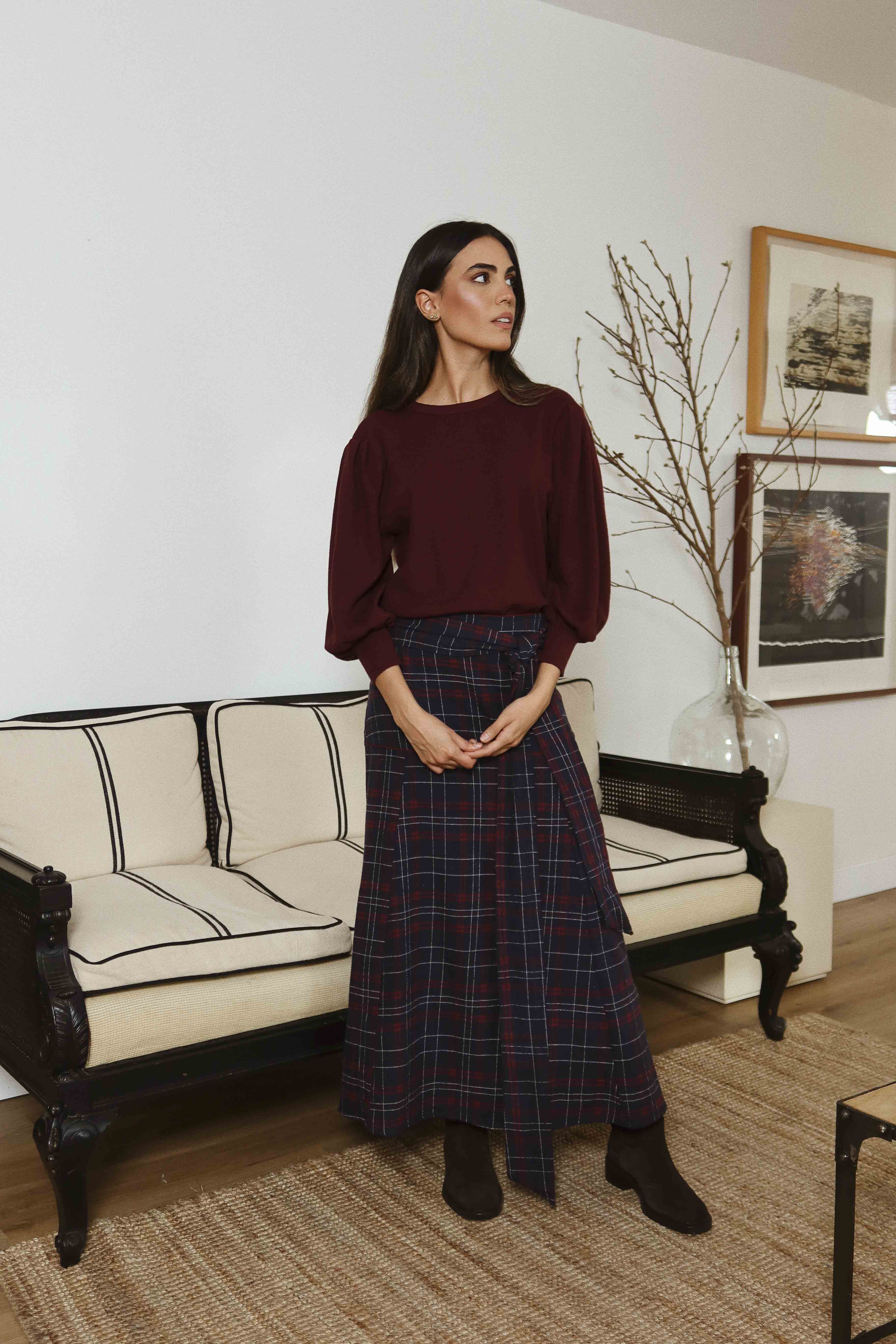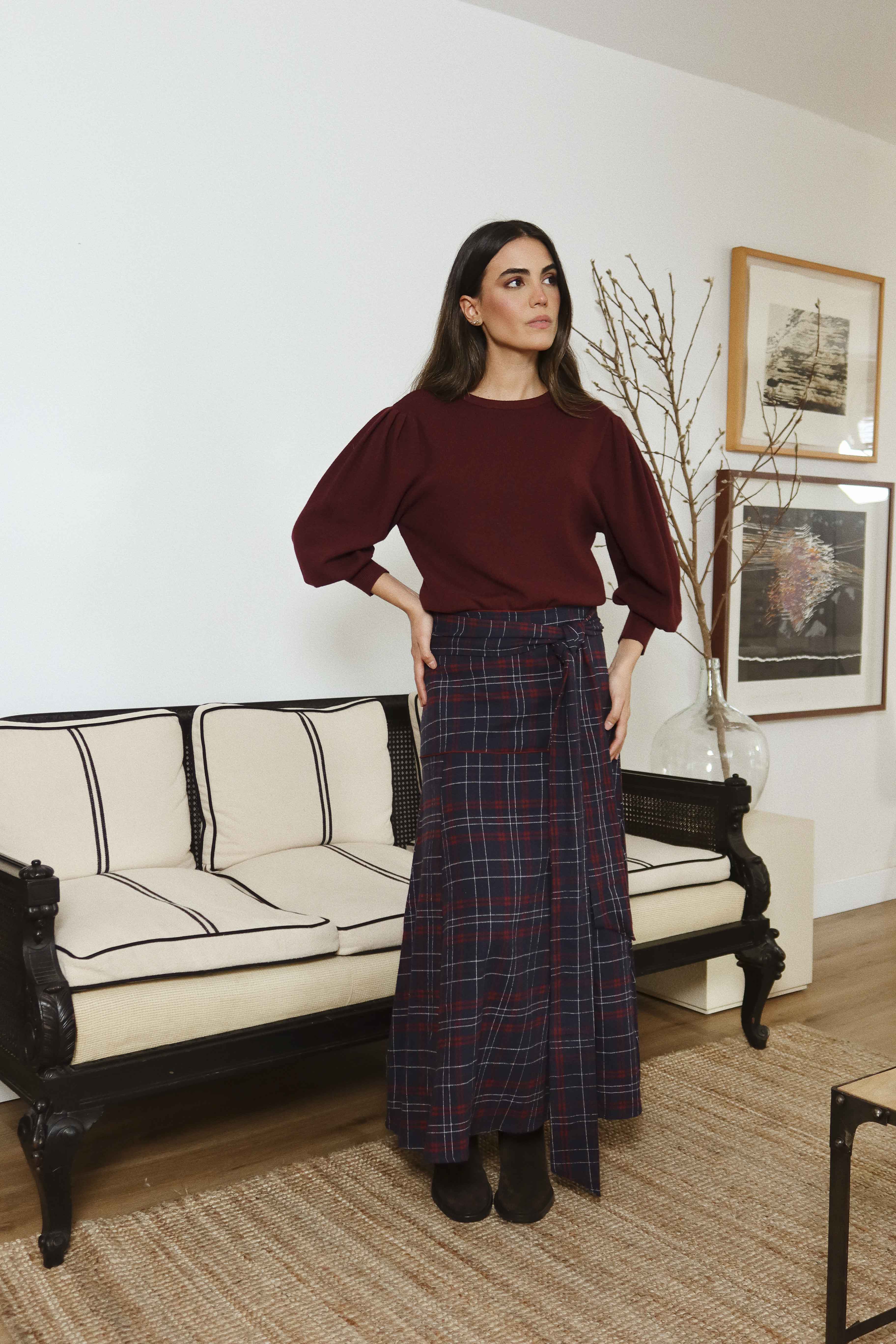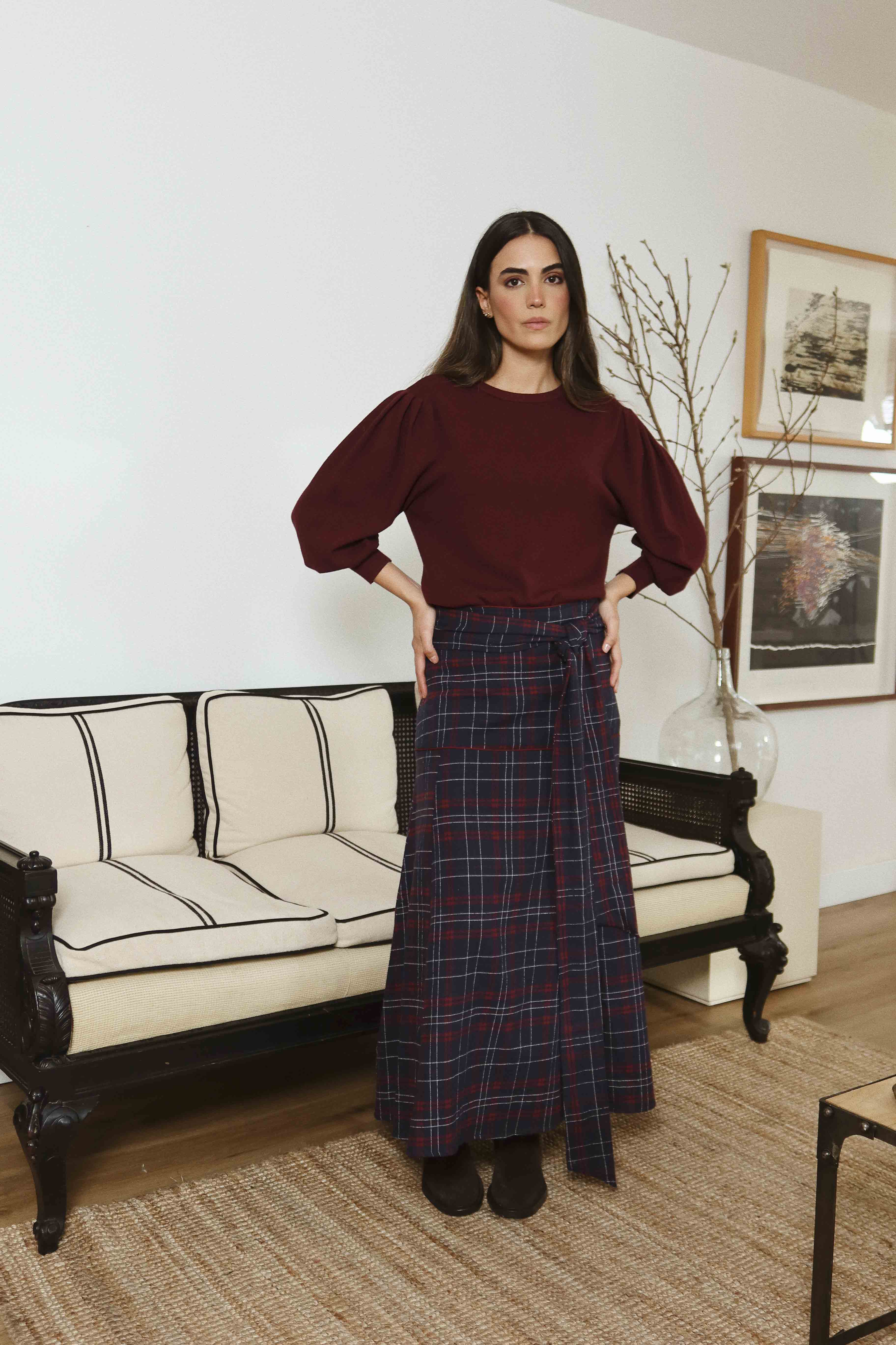 Falda larga con estampado escocés, cierre lateral con cremallera oculta. Incluye lazo.