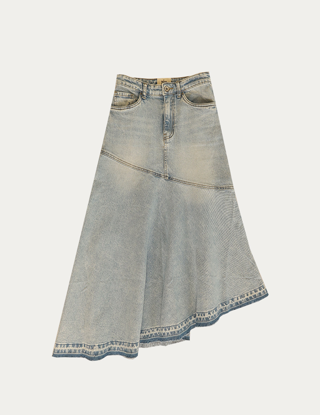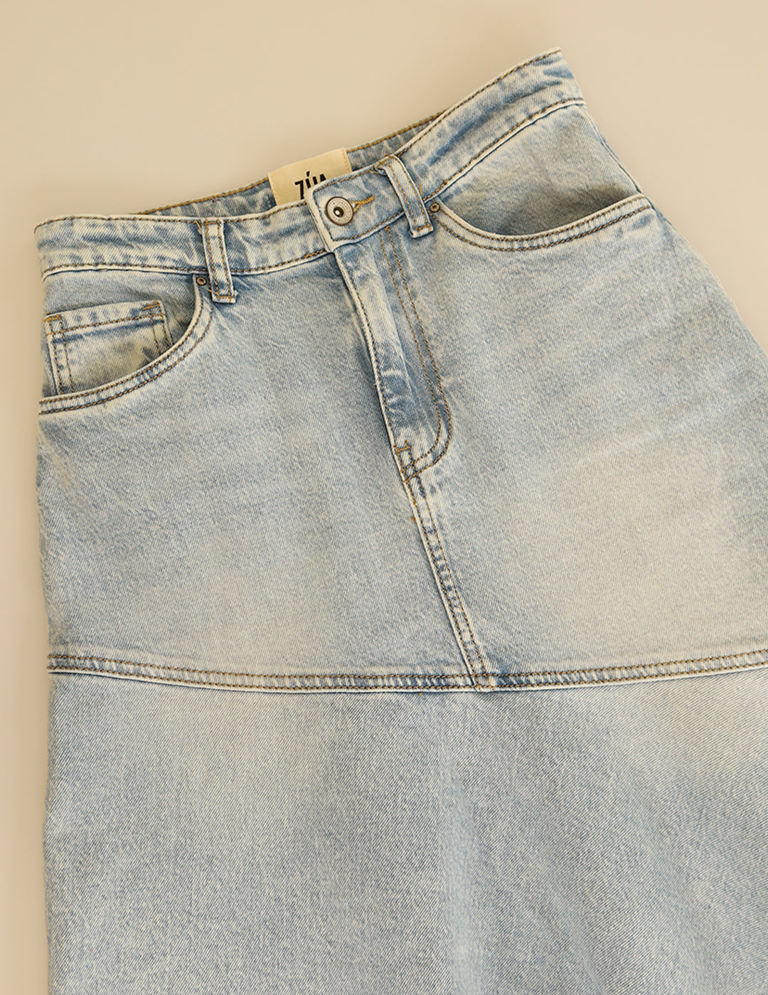 Falda asimétrica de algodón vaquero. Detalle de costura asimétrica.