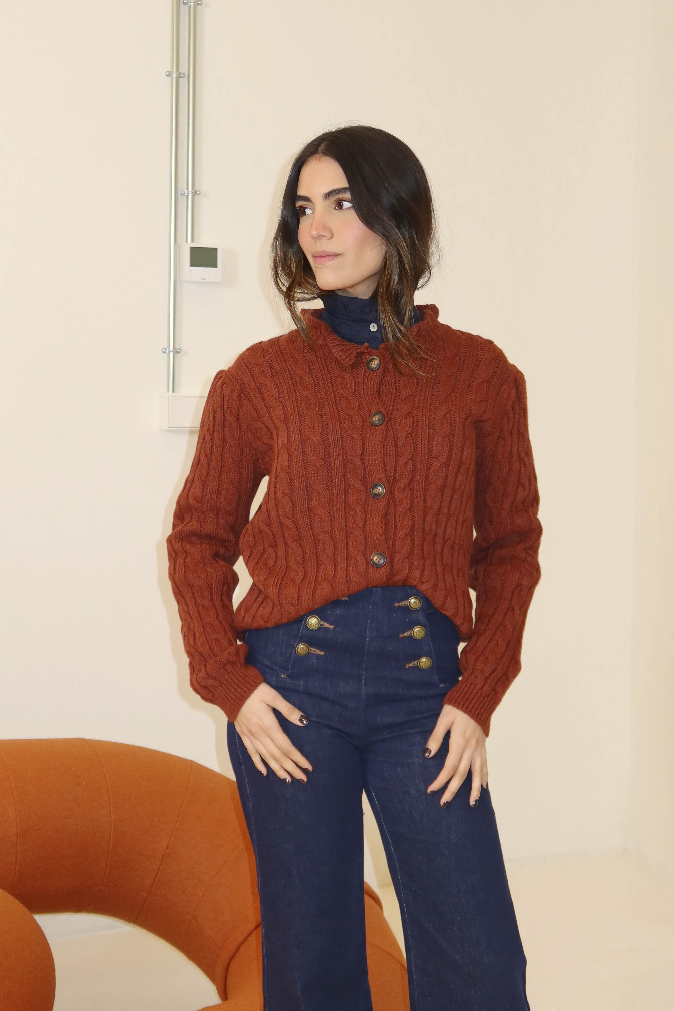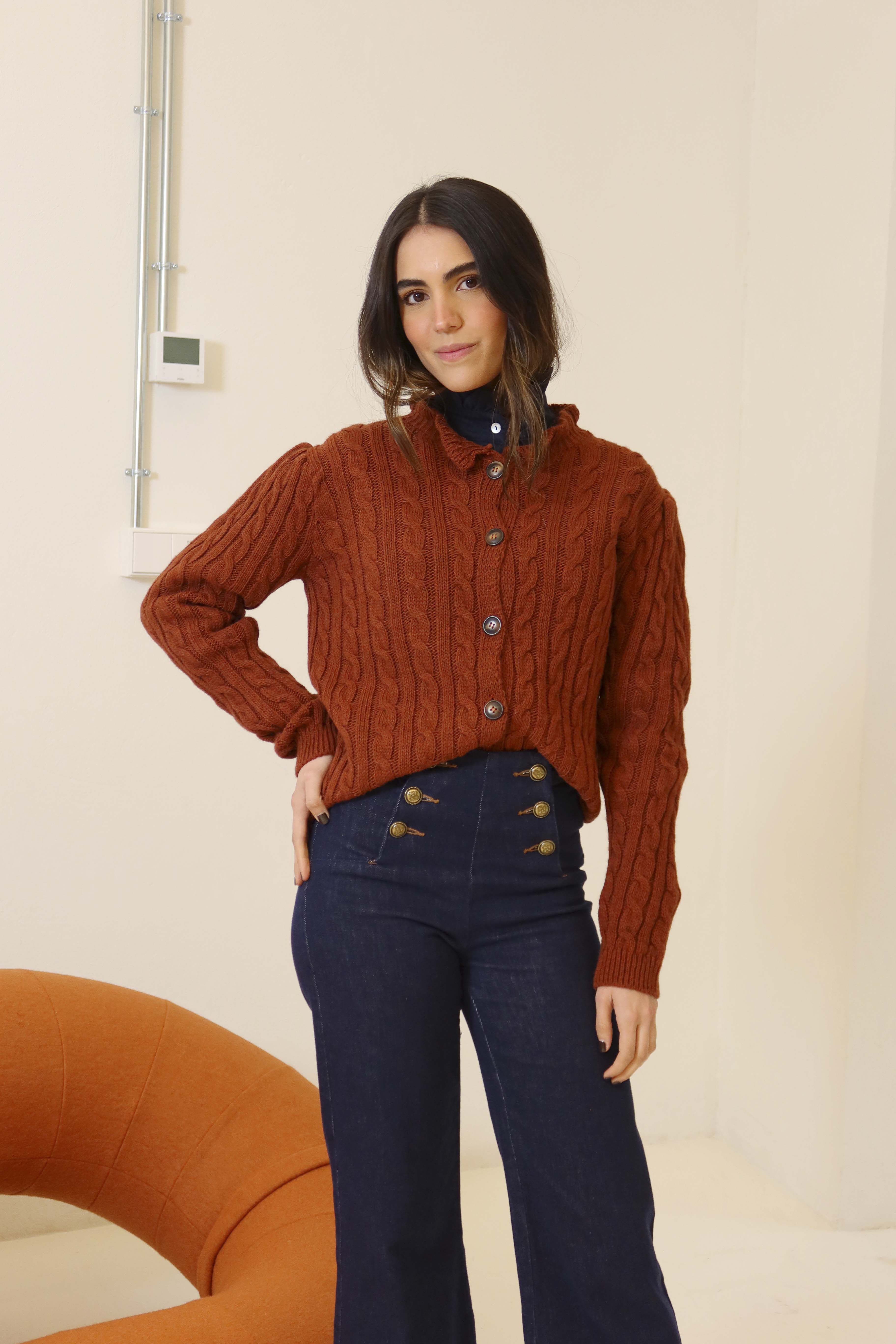 Chaqueta de punto, decorada con volantes en el cuello. Cierre delantero con botones.