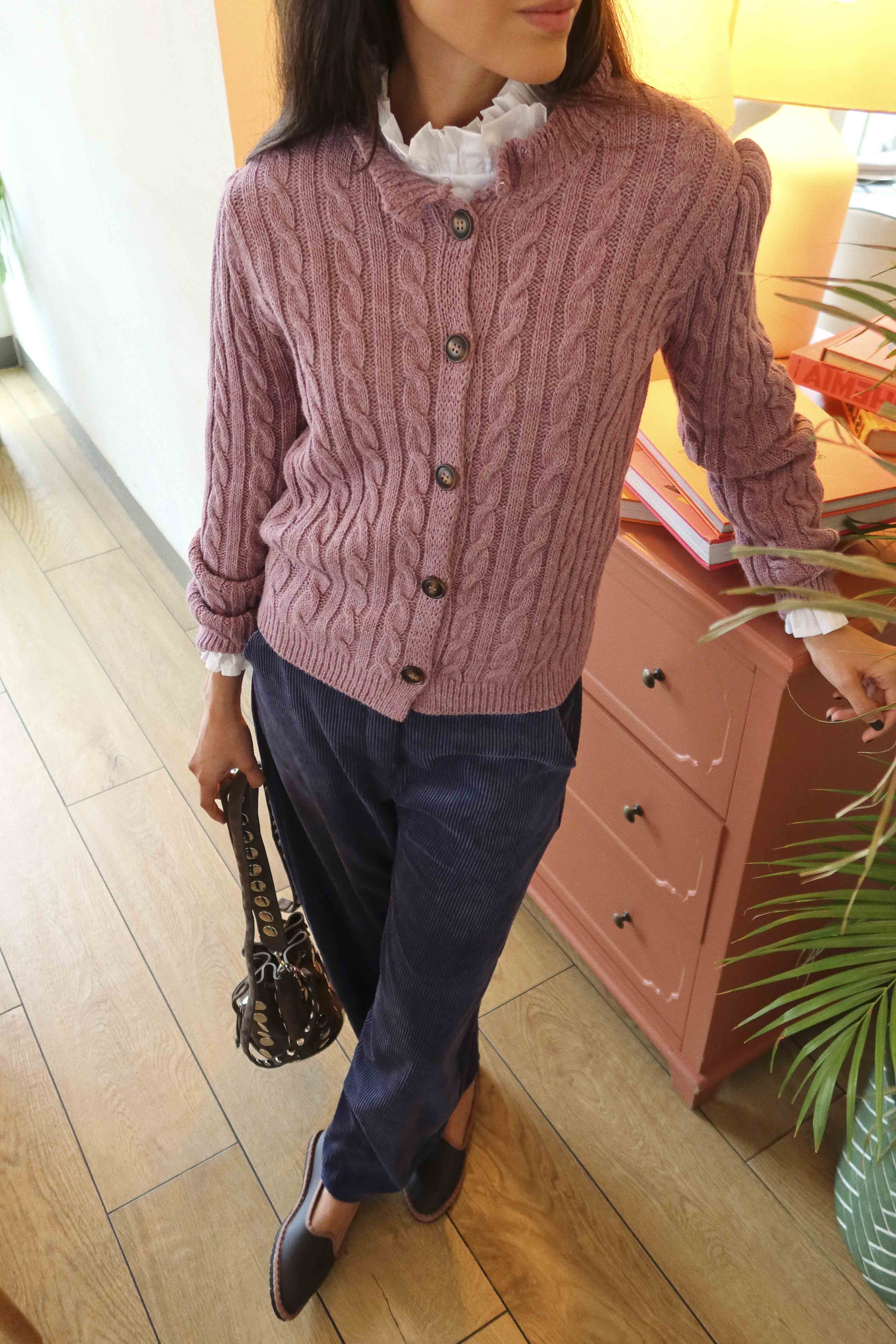 Chaqueta de punto, decorada con volantes en el cuello. Cierre delantero con botones.