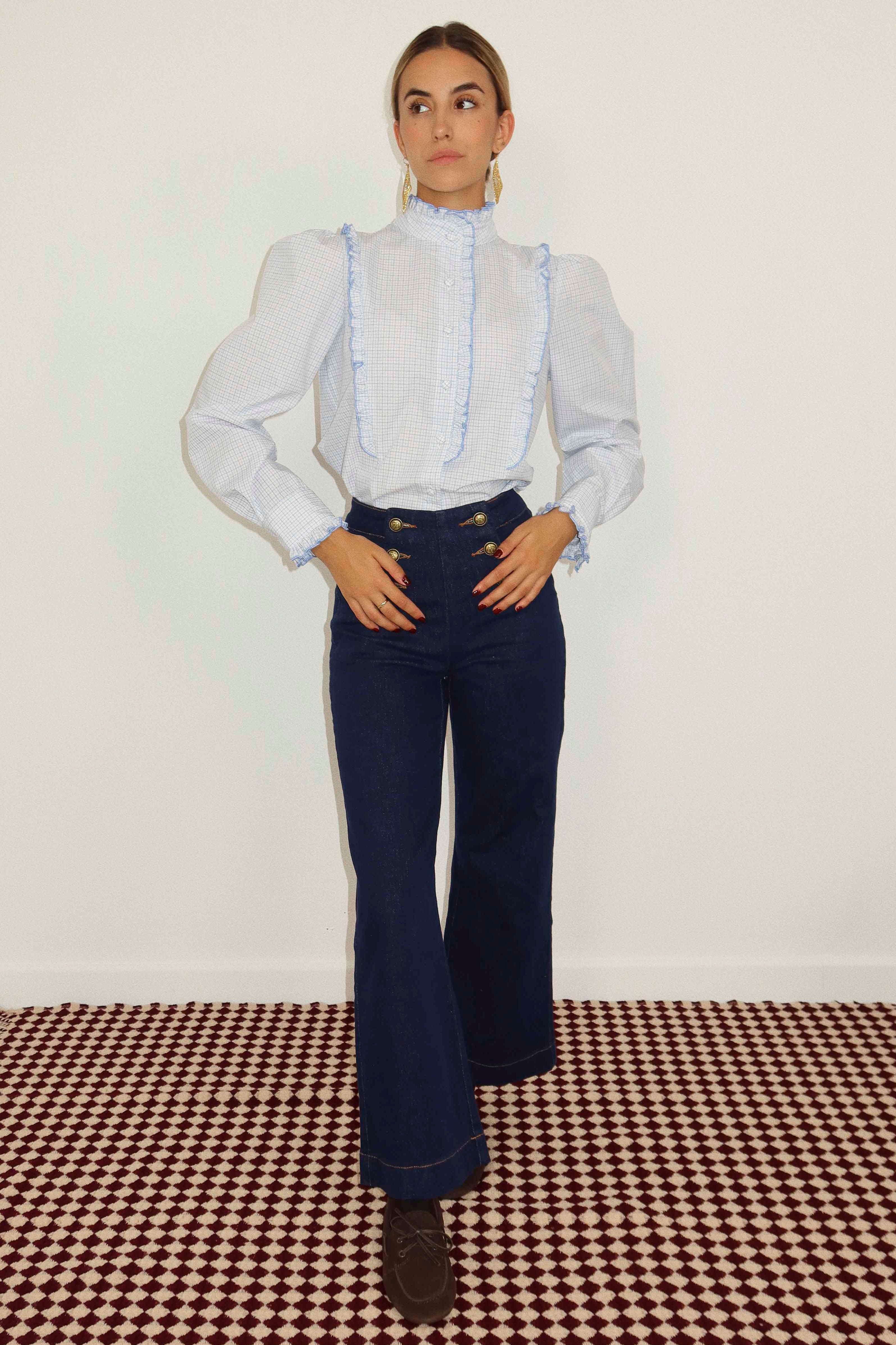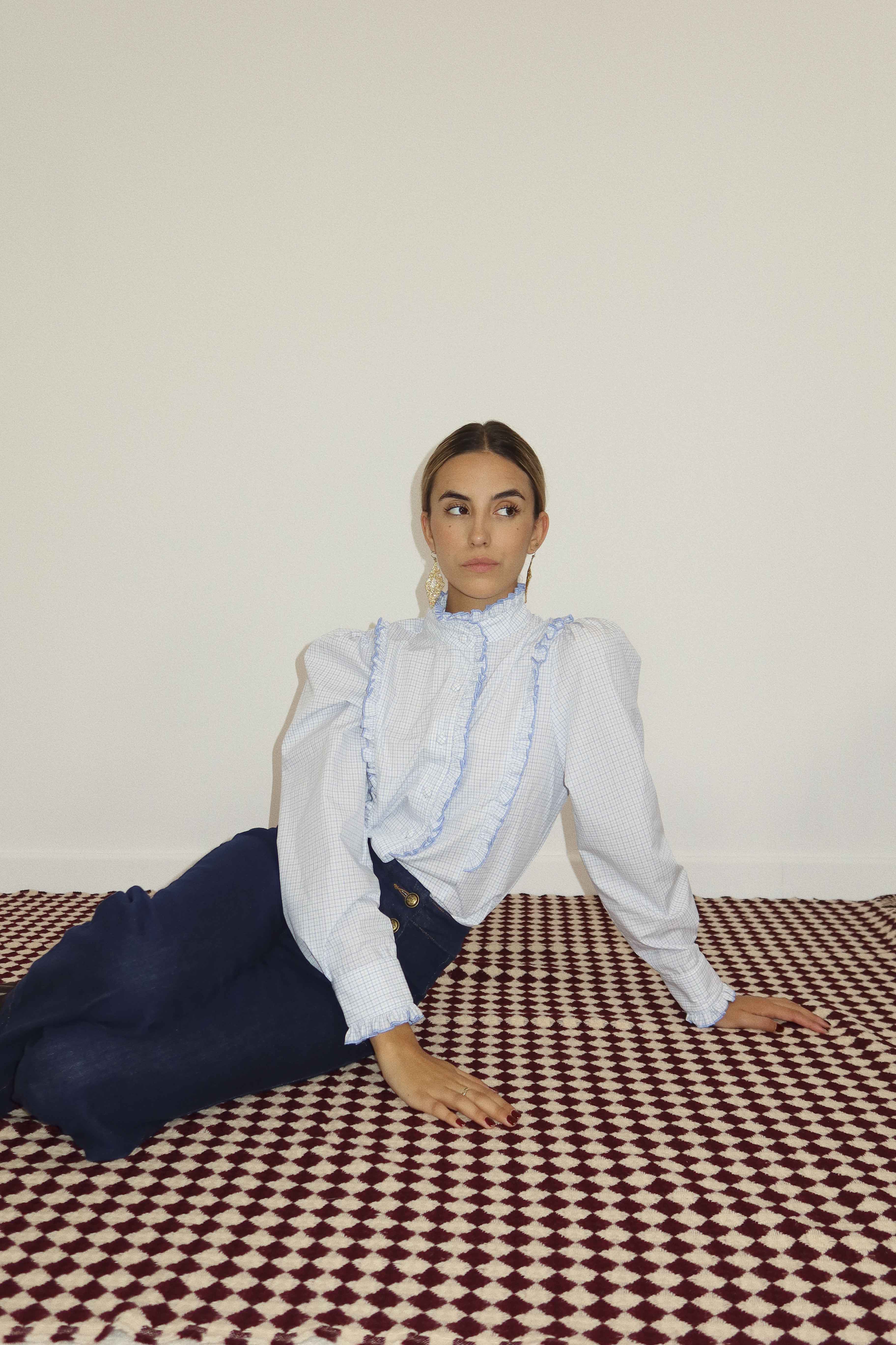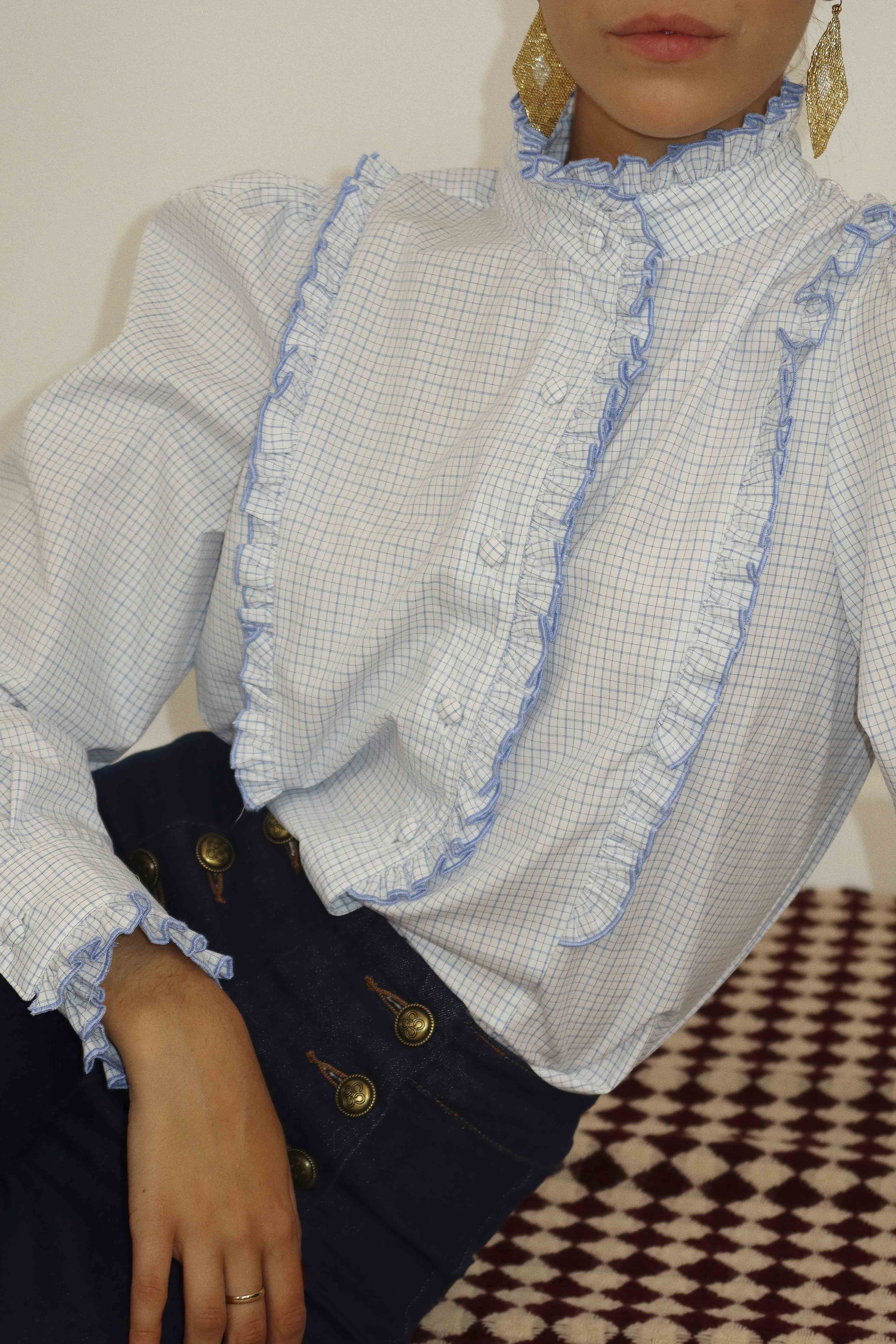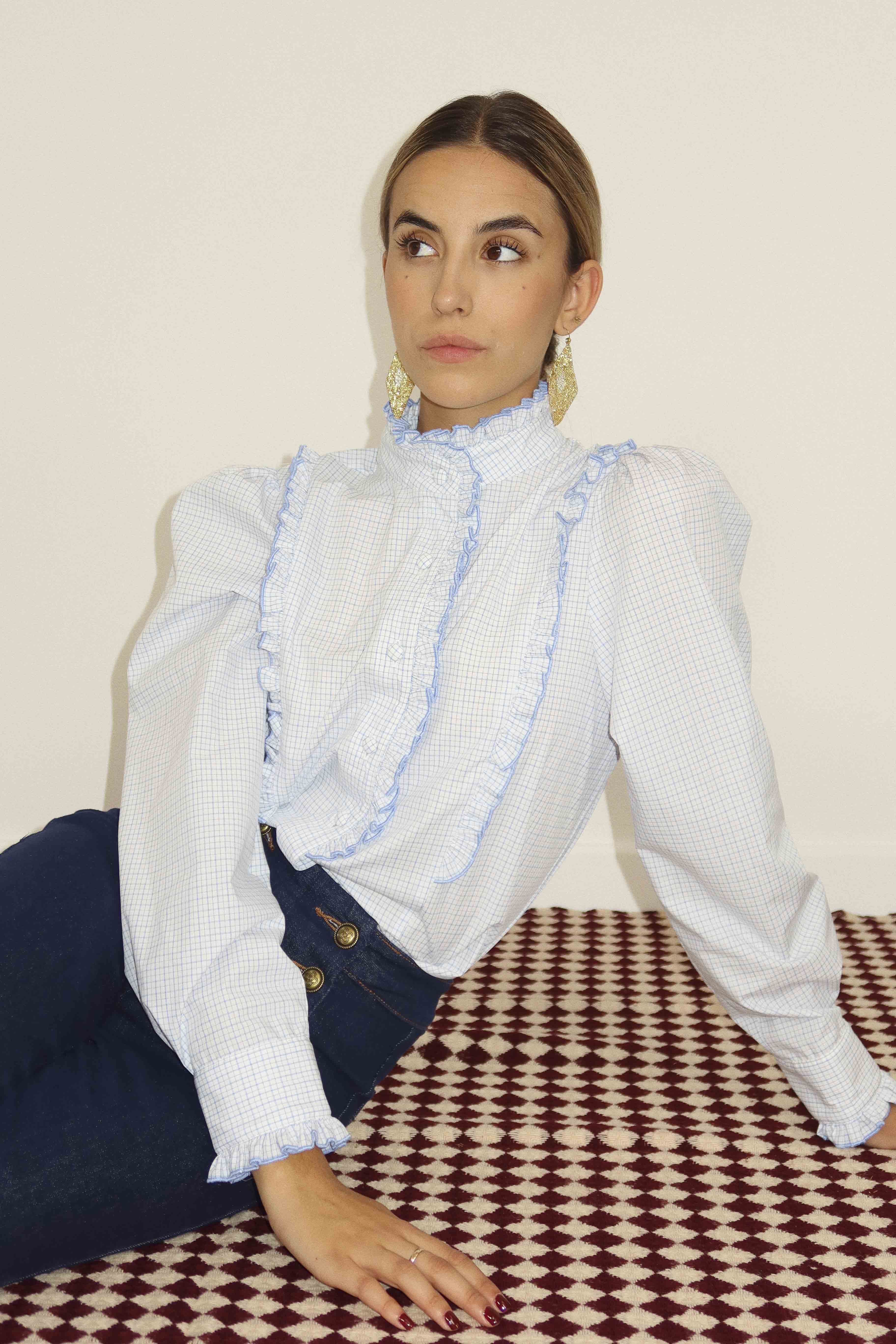Camisa de algodón de manga larga. Cuello de volantes. Decorada con volantes, cierre delantero con botones forrados y puño de volante cerrado con botón.
