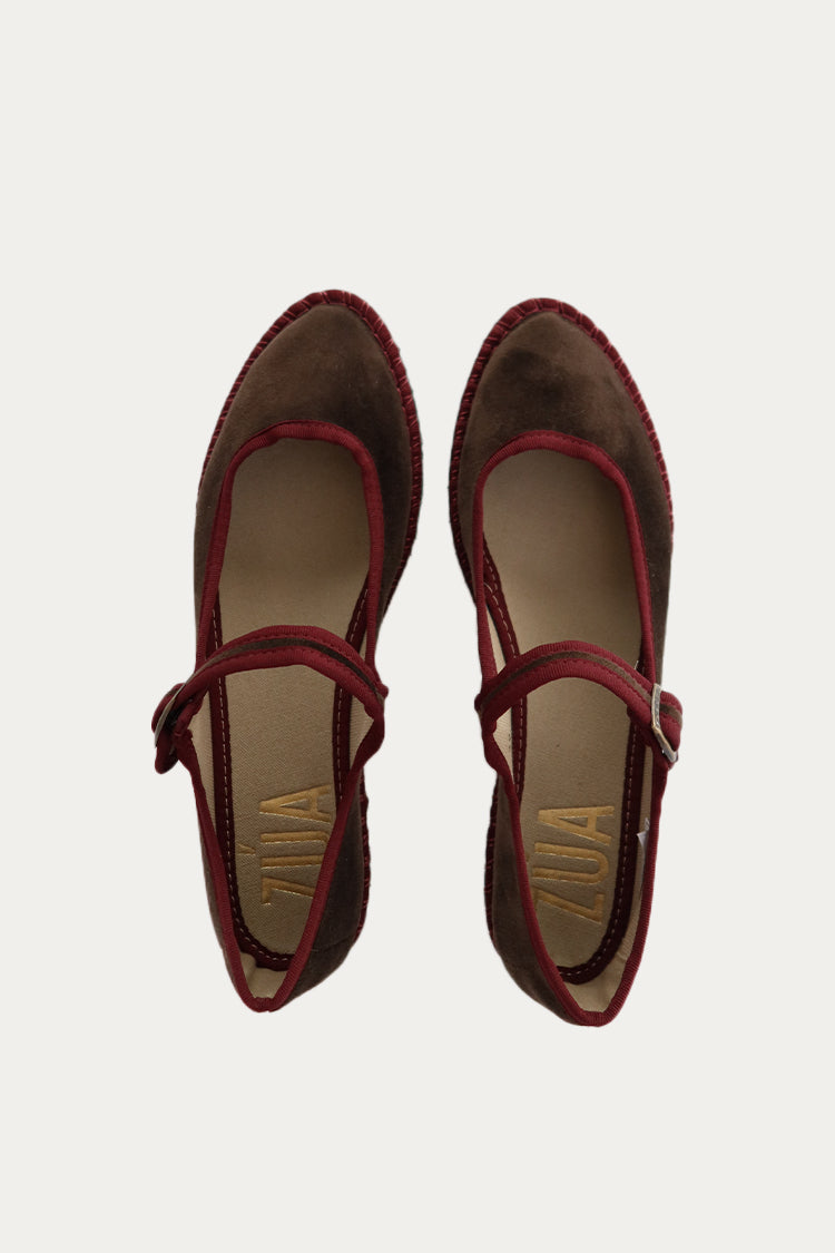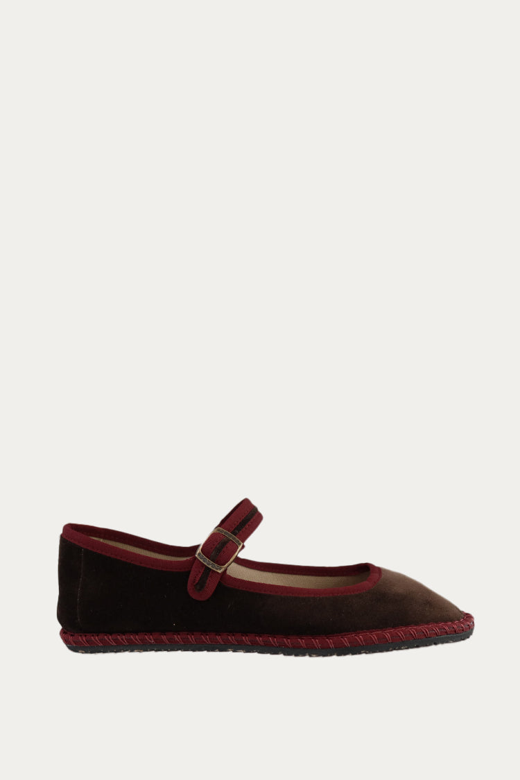 Zapato plano de terciopelo estilo Merceditas. Detalle ribetes a contraste. Cierre mediante hebilla o botón. Acabado en punta redonda. El exterior del zapato es 100% terciopelo de algodón y el interior del zapato es 100% algodón. La suela está hecha de caucho forrado con algodón.