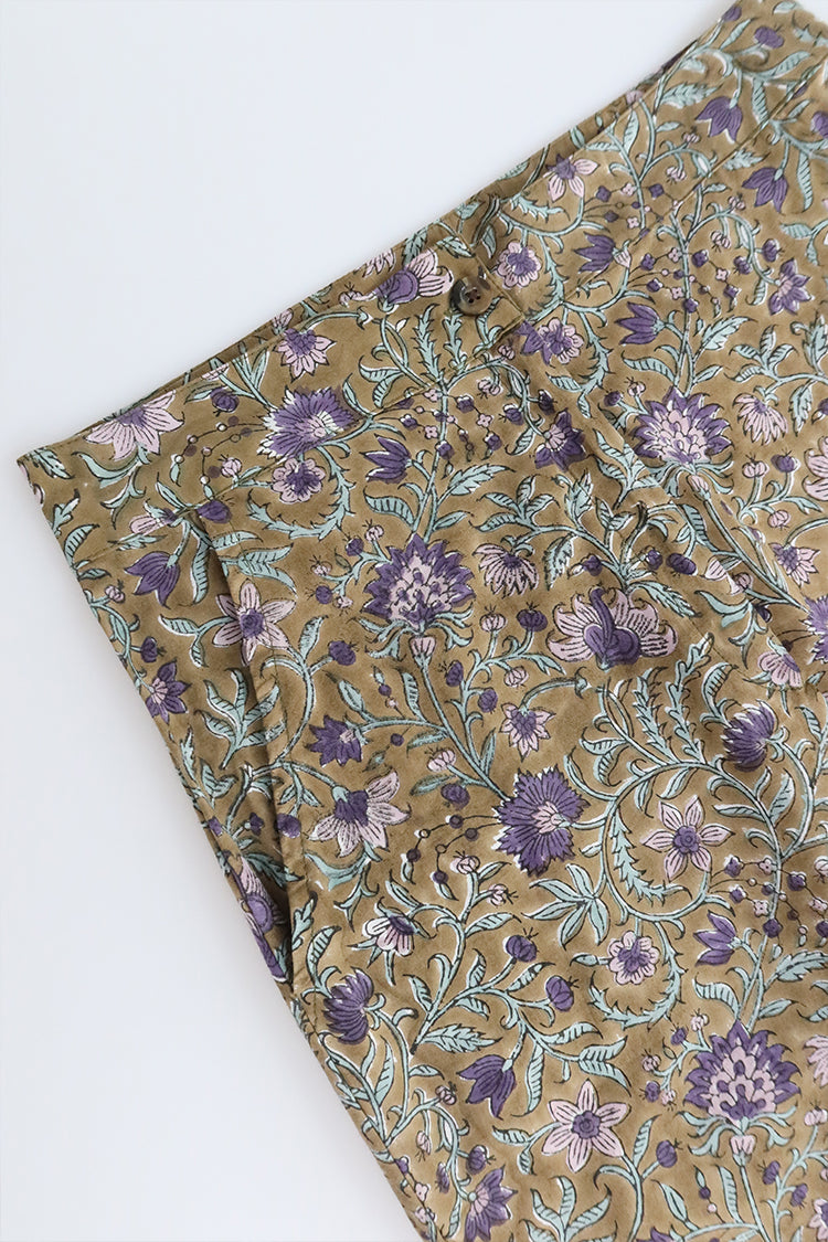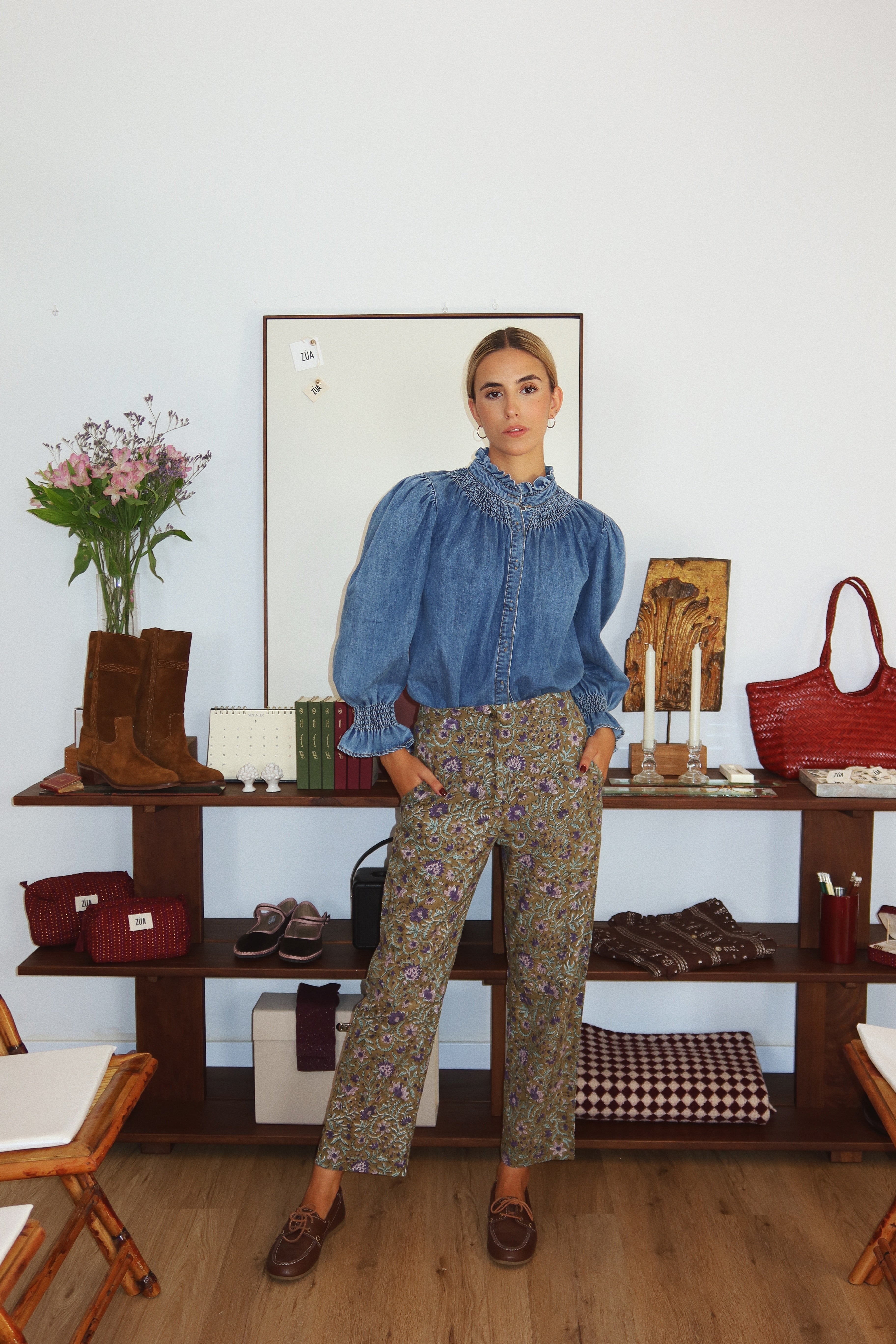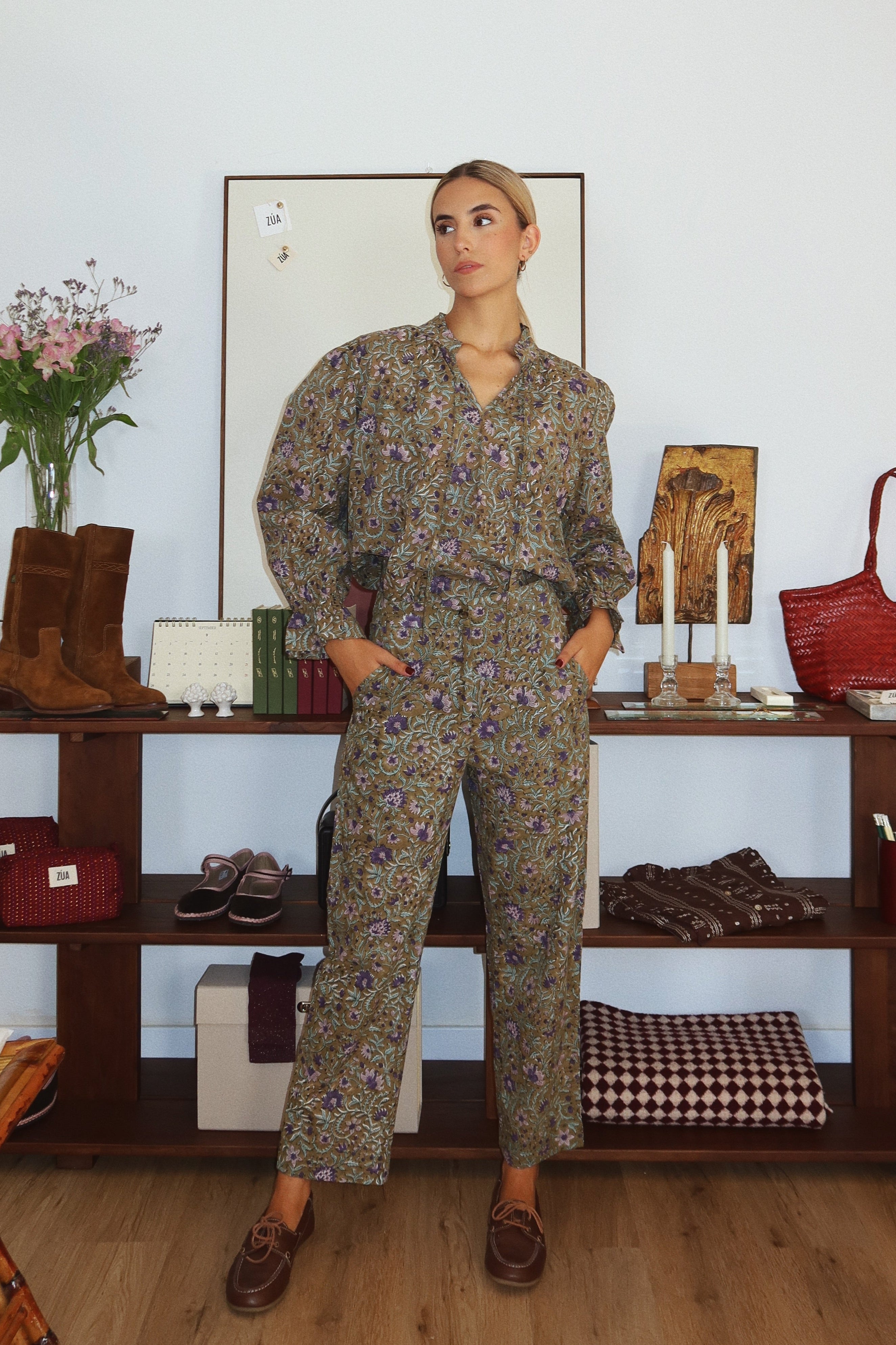 Esta prenda está fabricada de manera completamente artesanal mediante la técnica del BLOCKPRINT. Esta técnica ancestral se realiza sobre telares de 100 % algodón e implica el uso de bloques de madera tallados con diseños específicos, los cuales se impregnan con tintes naturales y se aplican manualmente sobre la tela.