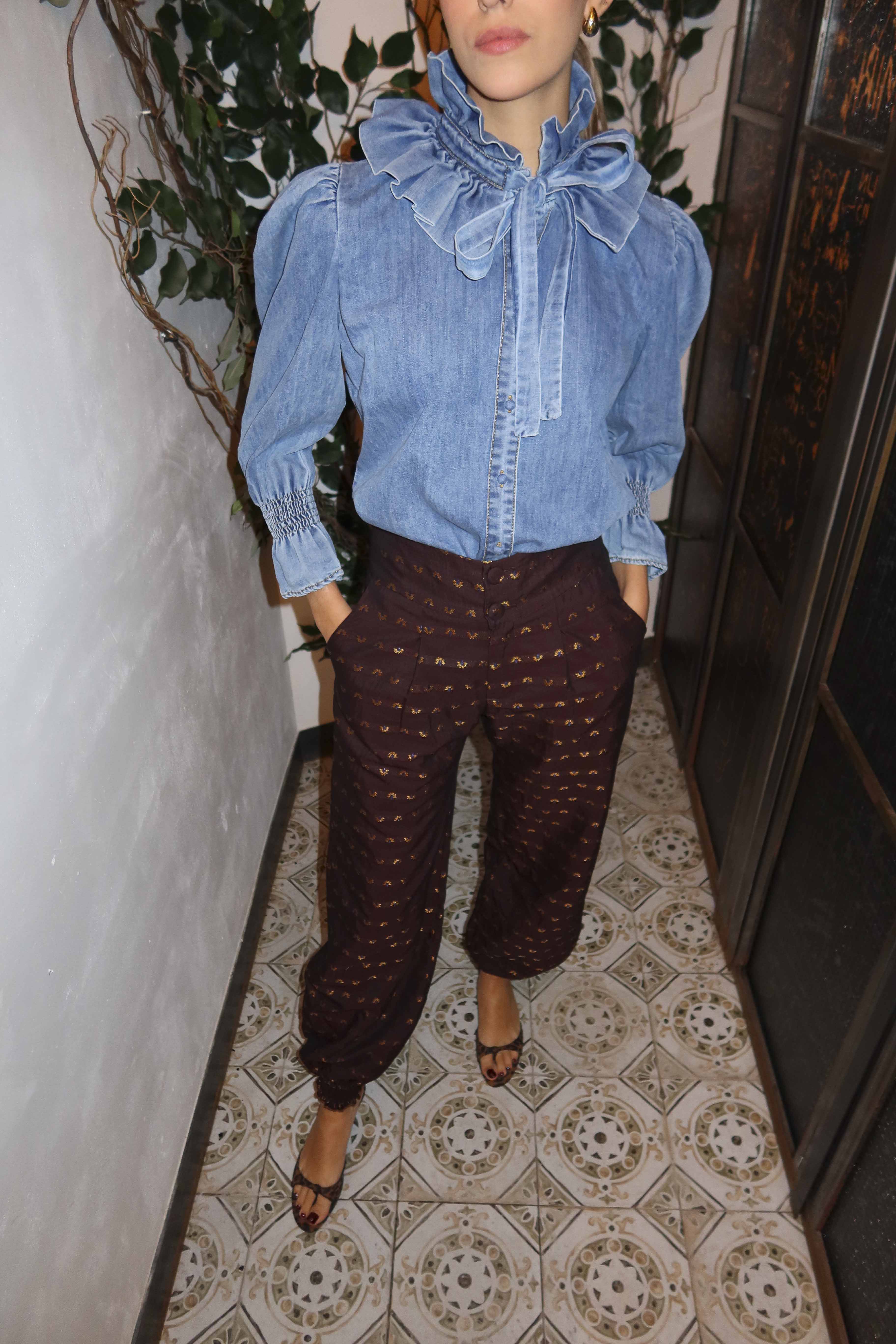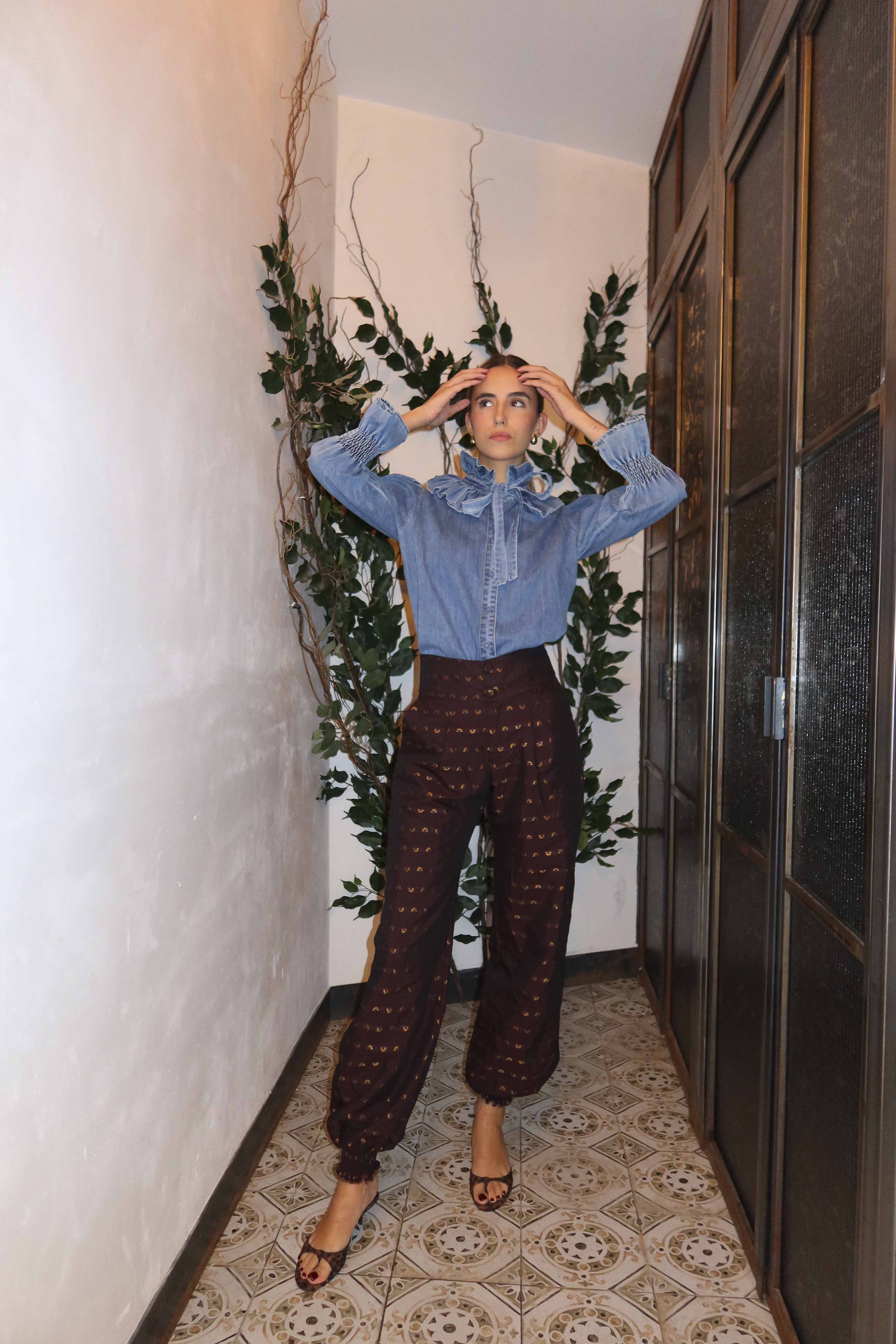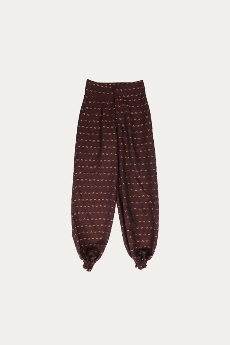 Pantalón bombacho, elástico en el tobillo. Cierre delantero con cremallera y botones forrados. Tiro alto 28 cm.