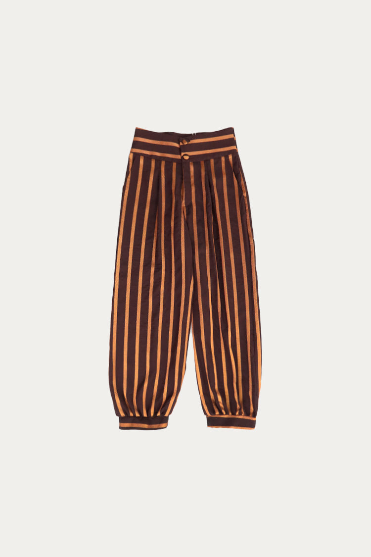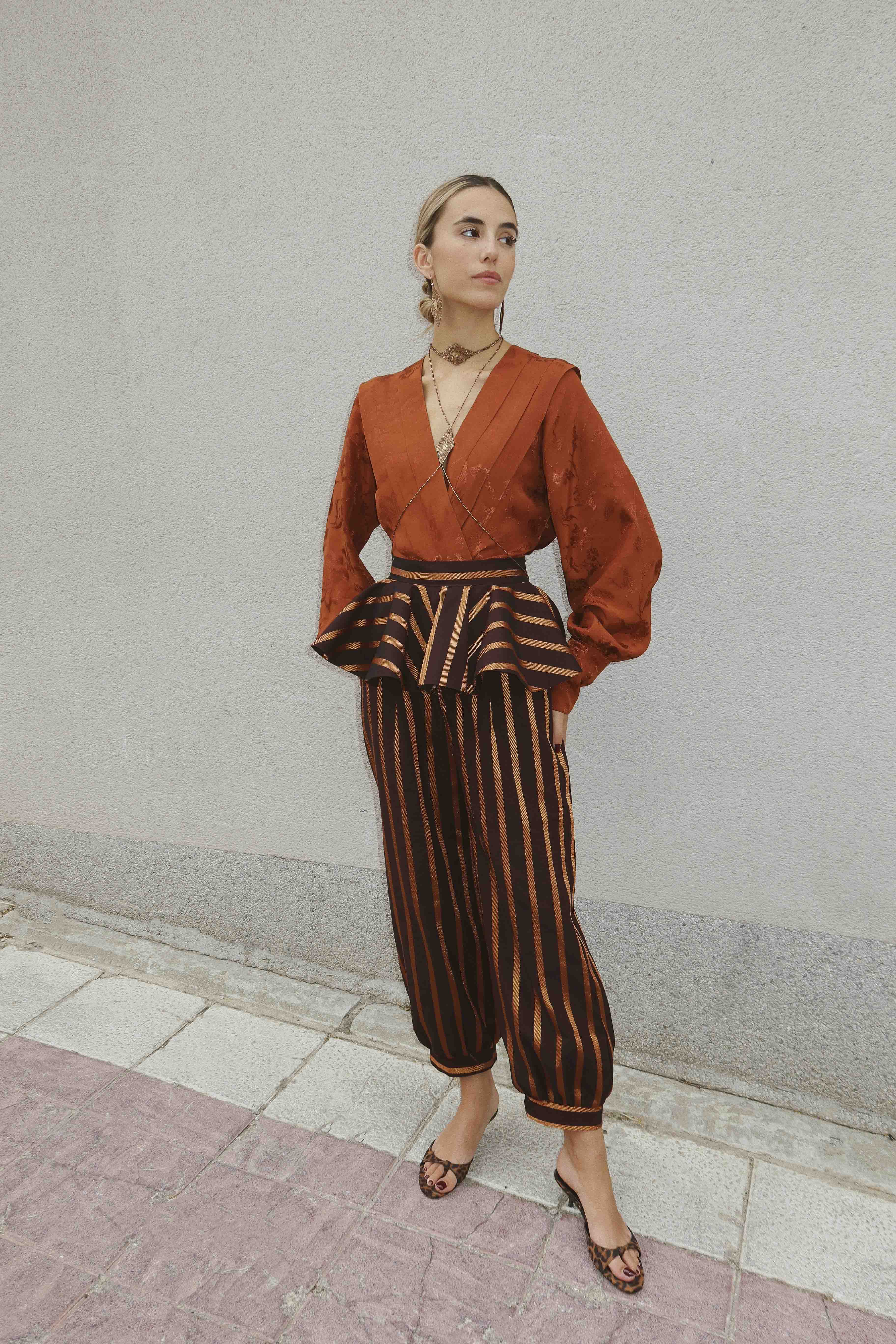 Pantalón bombacho, cierre delantero con botones forrados y cremallera. Tiro alto 28 cm.