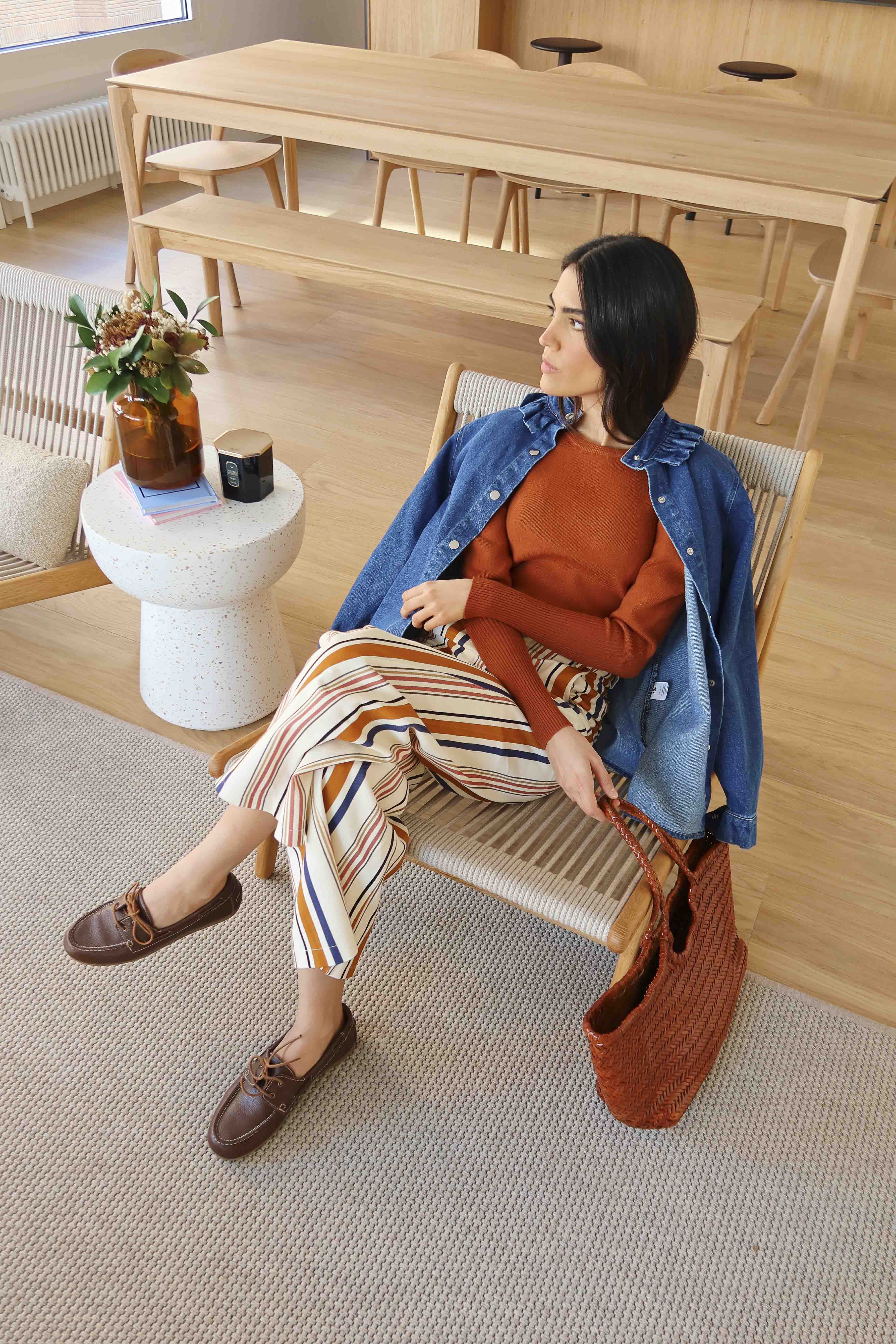 Pantalón recto, cierre delantero con botón y cremallera oculta, bolsillos laterales. Tiro medio 28 cm.