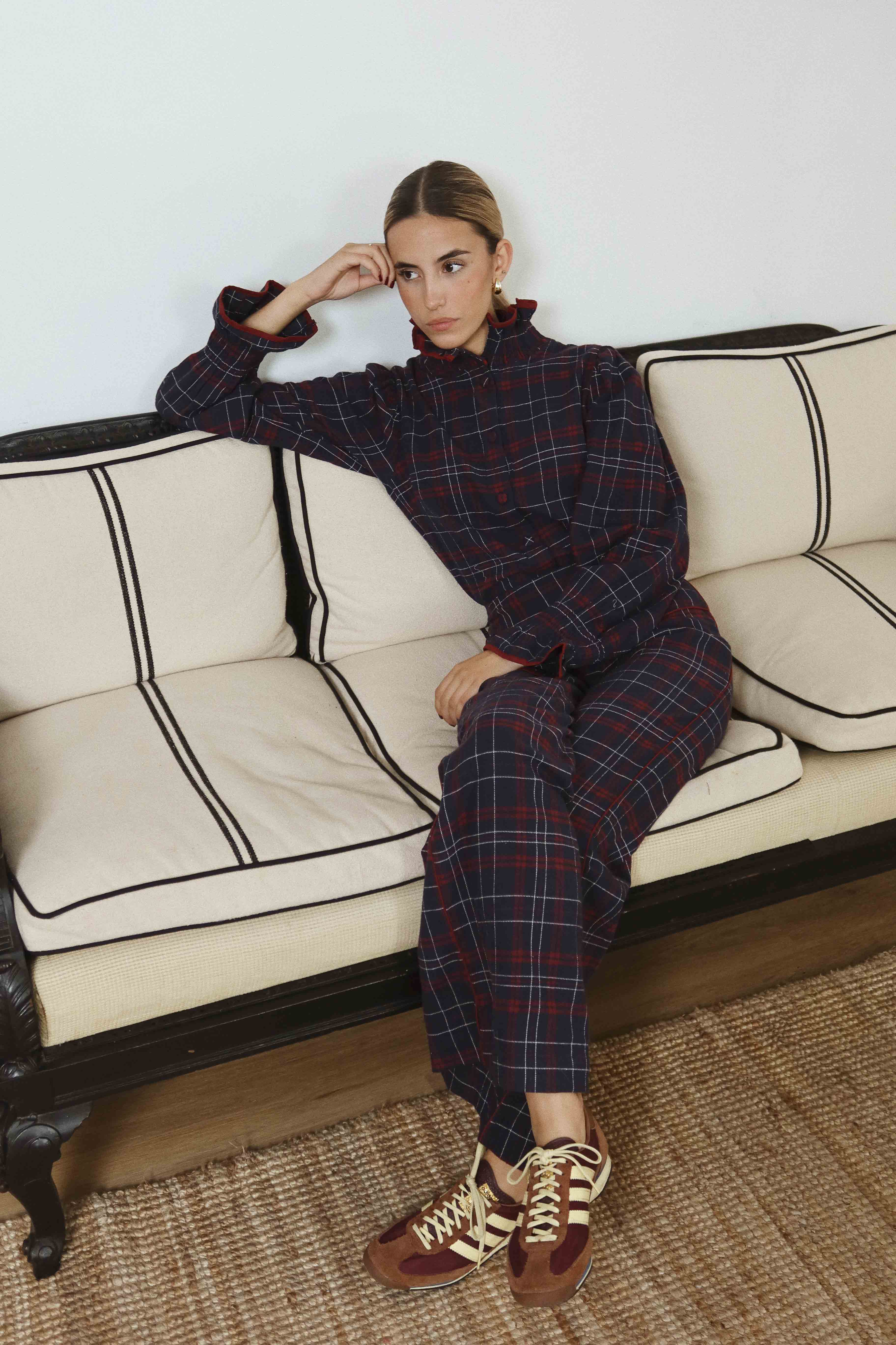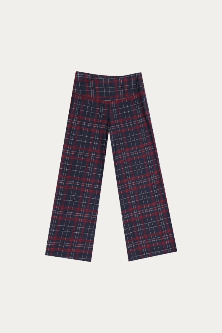 Pantalón largo con estampado escocés, cierre lateral con cremallera oculta. El tiro mide 30 cm.