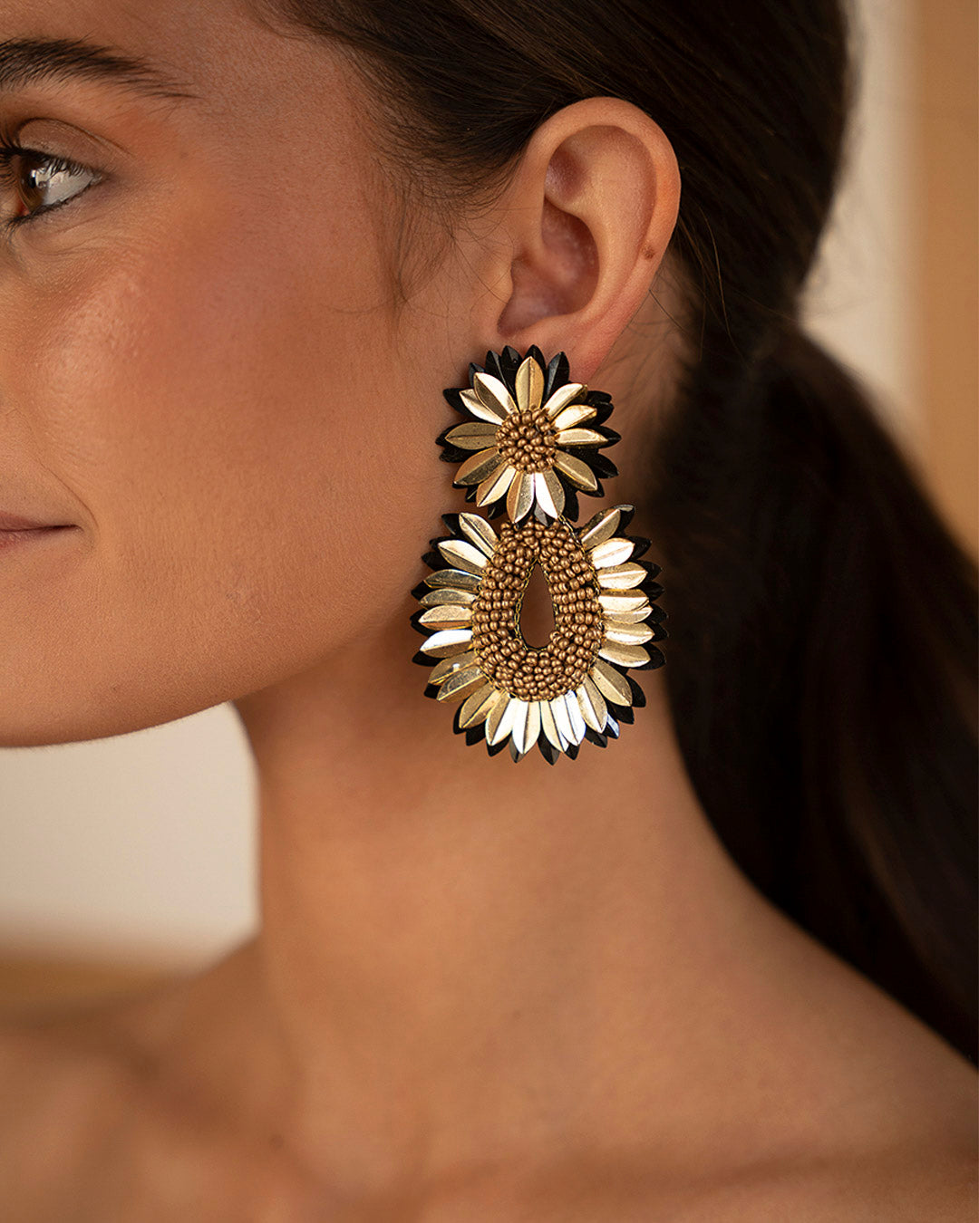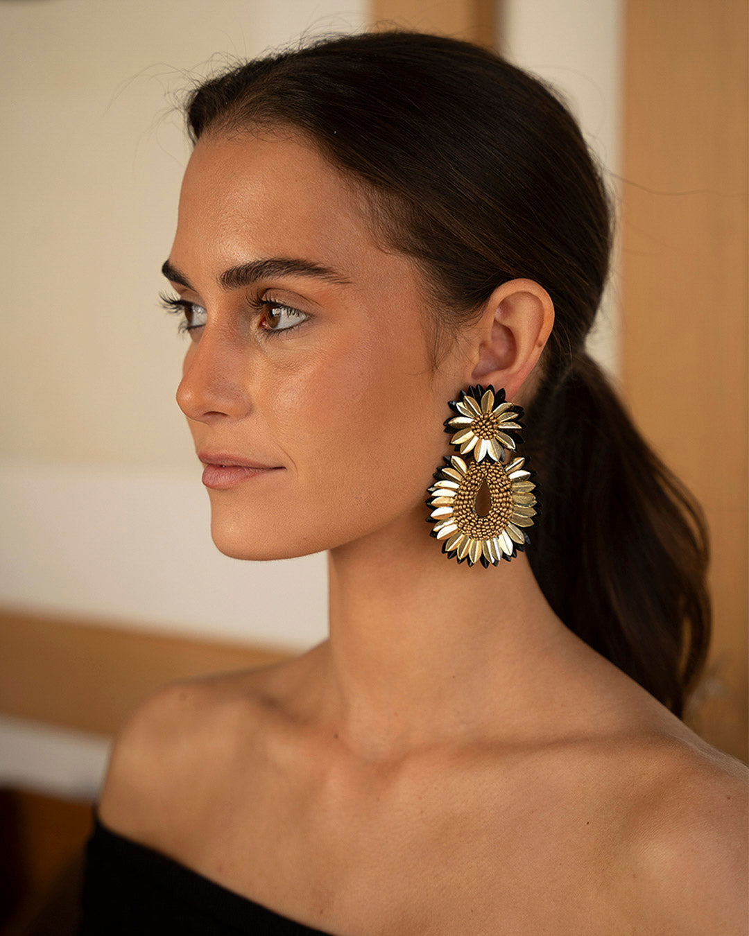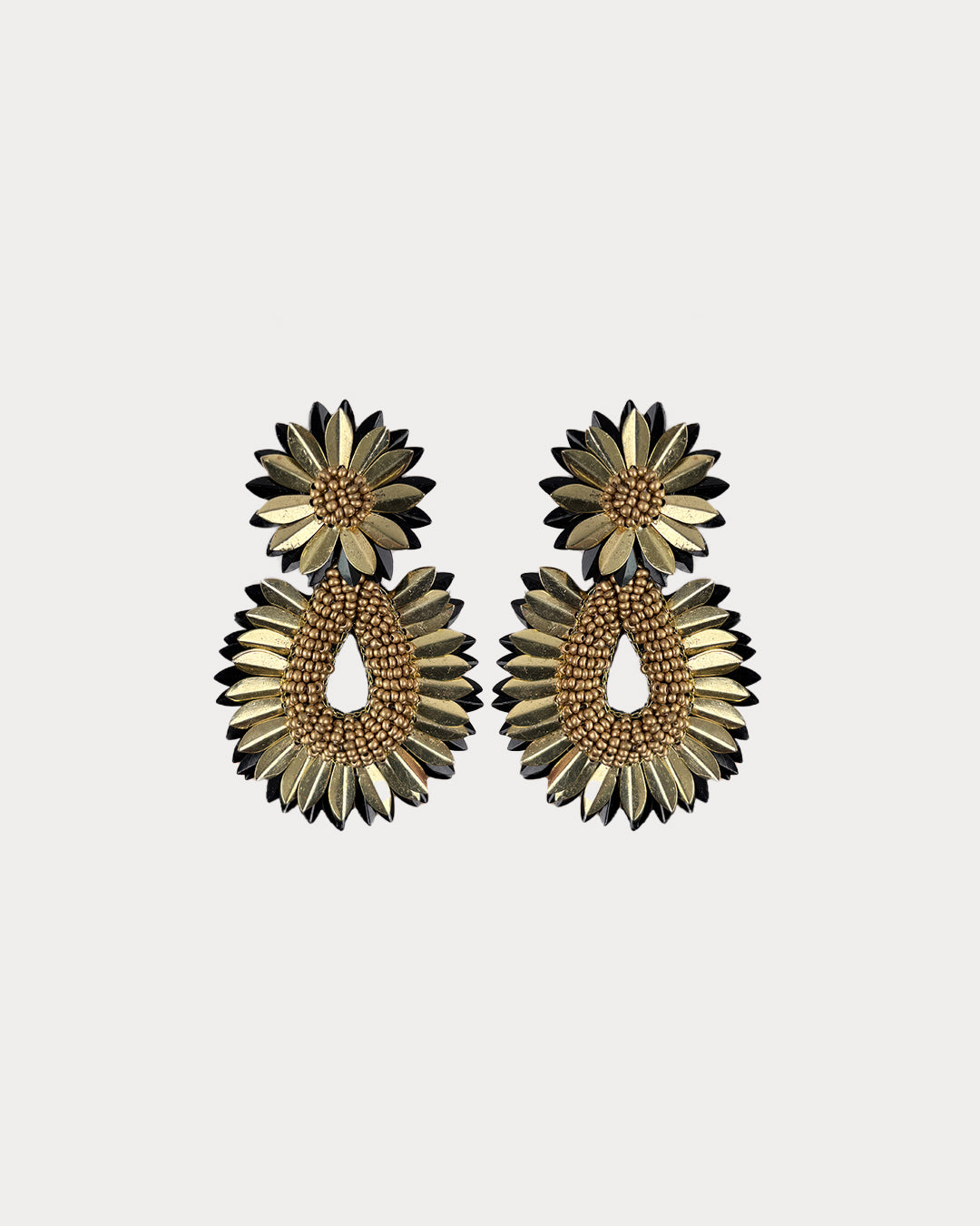 Pendientes metálicos colgantes en forma de flores. Cierre con tuerca.