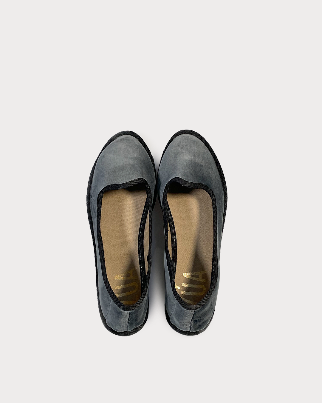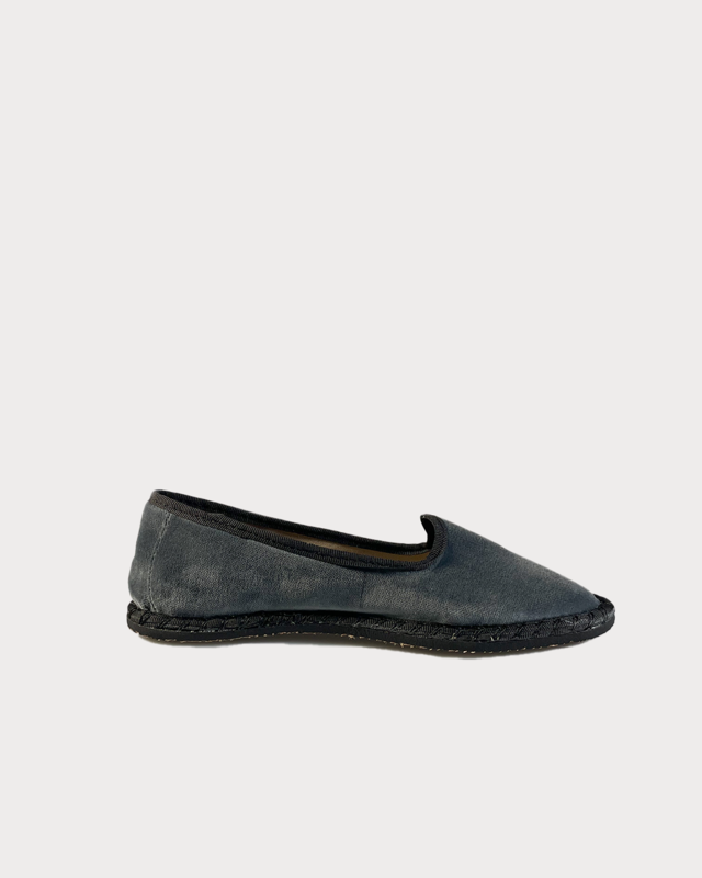 Zapato plano de terciopelo estilo veneciana. Detalle ribetes a contraste. El exterior del zapato es 100% terciopelo de algodón y el interior del zapato es 100% algodón. La suela está hecha de caucho forrado con algodón.